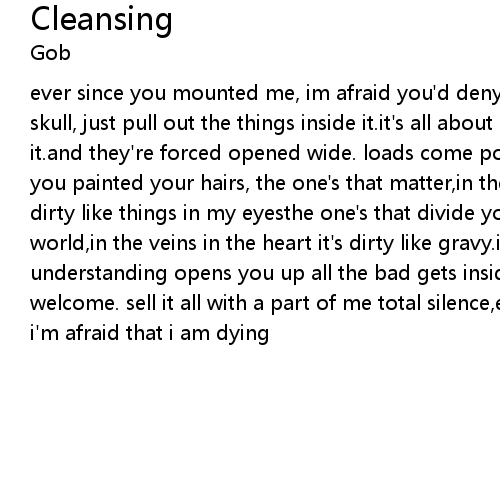ever since you mounted me, im afraid you'd deny it.you never need to break the skull, just pull out the things inside it.it's all about me i can't escape it.and they're forced opened wide. loads come pouring on everything,on your body you painted your hairs, the one's that matter,in the veins in the heart it's dirty like things in my eyesthe one's that divide you. i can see around the world,in the veins in the heart it's dirty like gravy.i've got problems. understanding opens you up all the bad gets inside you.all emotions will be welcome. sell it all with a part of me total silence,ever since you mounted me i'm afraid that i am dying |