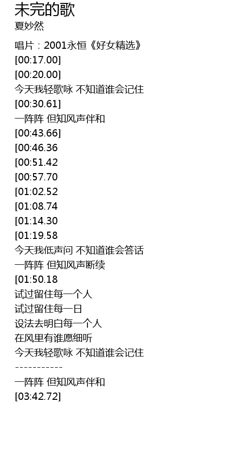 | [03:23.92] | 今天我轻歌咏 不知道谁会记住 |