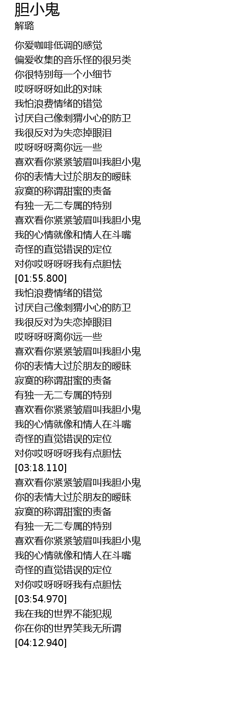 | [01:35.250] | 喜欢看你紧紧皱眉叫我胆小鬼 |