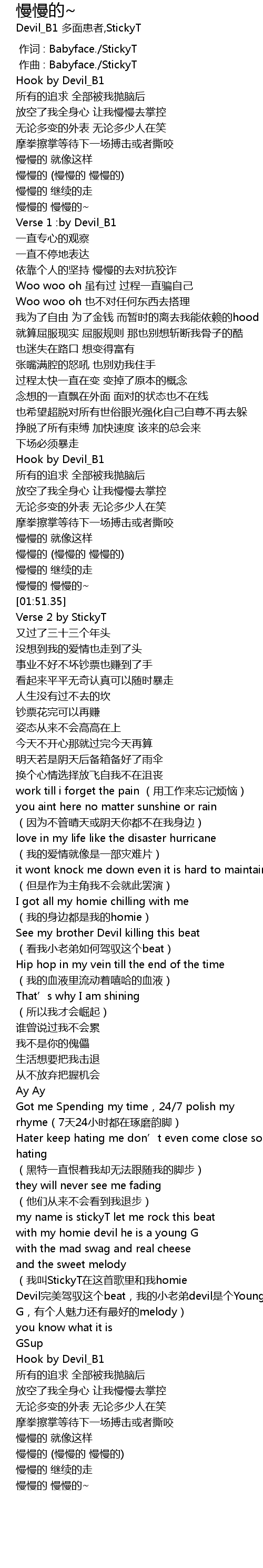 | [03:01.20] | wǒ jiào StickyT zài zhè shǒu gē lǐ hé wǒ homie Devil wán měi jià yù zhè gè beat, wǒ de xiǎo lǎo dì devil shì gè Young G, yǒu gè rén mèi lì hái yǒu zuì hǎo de melody |