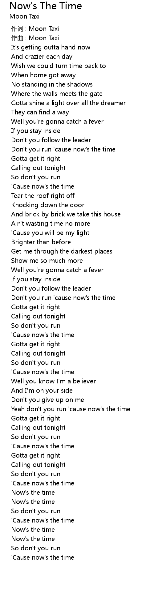 | [00:50.380] | Don't you run 'cause now's the time |