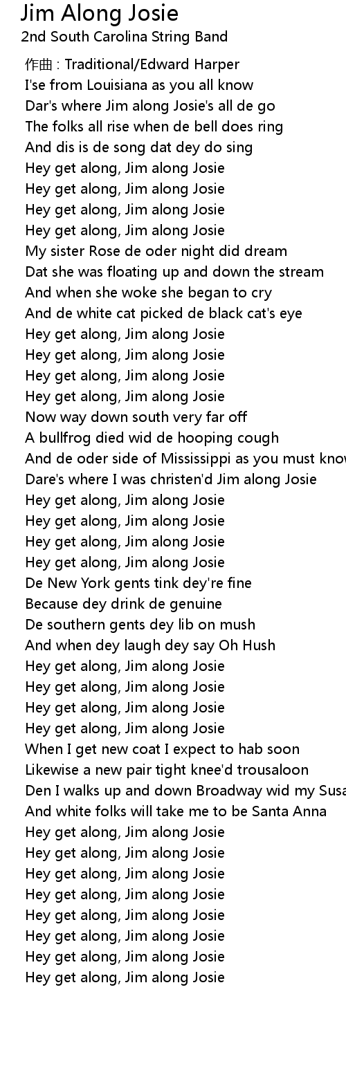 | [00:33.246] | Hey get along, Jim along Josie |
