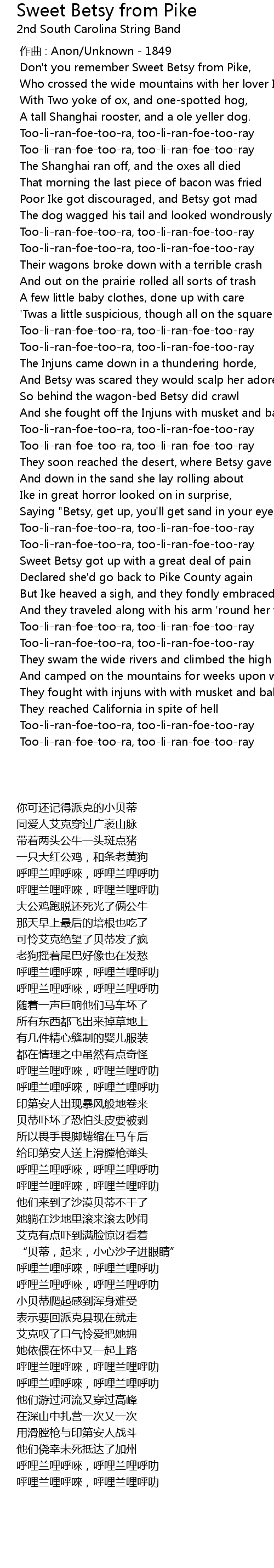 | [00:09.798] | Don't you remember Sweet Betsy from Pike, |