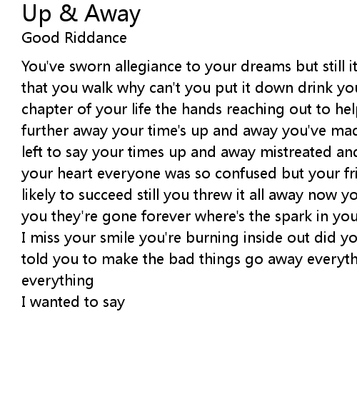 You've sworn allegiance to your dreams but still it seems so hard that tightrope that you walk why can't you put it down drink your way through one more clouded chapter of your life the hands reaching out to help you only seemed to push you further away your time's up and away you've made your choice now there's nothing left to say your times up and away mistreated and abused but they couldn't steal your heart everyone was so confused but your friends all played their part most likely to succeed still you threw it all away now your dreams lie buried next to you they're gone forever where's the spark in your eye |