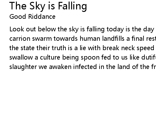 | Look out below the sky is falling today is the day the weak will be slain see carrion swarm towards human landfills a final resting place for the enemies of the state their truth is a lie with break neck speed and sterile affection we swallow a culture being spoon fed to us like dutiful sheep being led to the slaughter we awaken infected in the land of the free and the home of the brave |