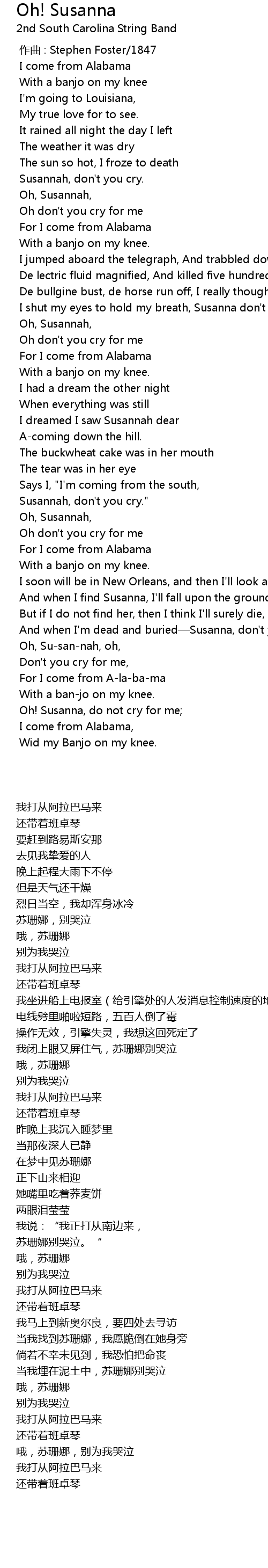 | [02:32.093] | Oh! Susanna, do not cry for me |