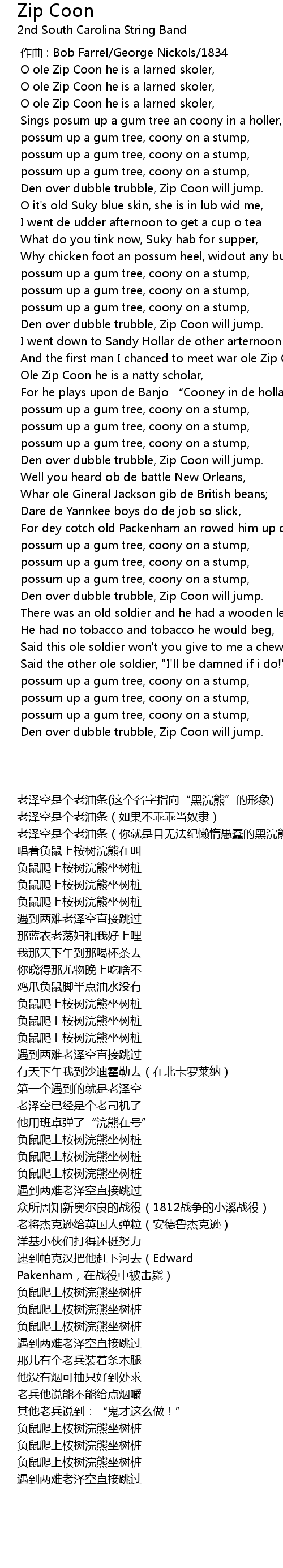 | [02:52.852] | Den over dubble trubble, Zip Coon will jump. |