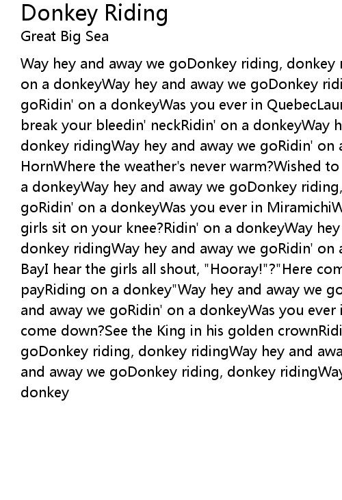 Way hey and away we goDonkey riding, donkey ridingWay hey and away we goRidin' on a donkeyWay hey and away we goDonkey riding, donkey ridingWay hey and away we goRidin' on a donkeyWas you ever in QuebecLaunchin' timber on the deck?Where ya break your bleedin' neckRidin' on a donkeyWay hey and away we goDonkey riding, donkey ridingWay hey and away we goRidin' on a donkeyWas you ever 'round Cape HornWhere the weather's never warm?Wished to God you'd never been bornRidin' on a donkeyWay hey and away we goDonkey riding, donkey ridingWay hey and away we goRidin' on a donkeyWas you ever in MiramichiWhere ye tie up to a treeAn' the girls sit on your knee?Ridin' on a donkeyWay hey and away we goDonkey riding, donkey ridingWay hey and away we goRidin' on a donkeyWas you ever in Fortune BayI hear the girls all shout, "Hooray!"?"Here comes dad with ten weeks payRiding on a donkey"Way hey and away we goDonkey riding, donkey ridingWay hey and away we goRidin' on a donkeyWas you ever in FrederictonSee the King he does come down?See the King in his golden crownRiding on a donkeyWay hey and away we goDonkey riding, donkey ridingWay hey and away we goRidin' on a donkeyWay hey and away we goDonkey riding, donkey ridingWay hey and away we goRidin' on a donkey |