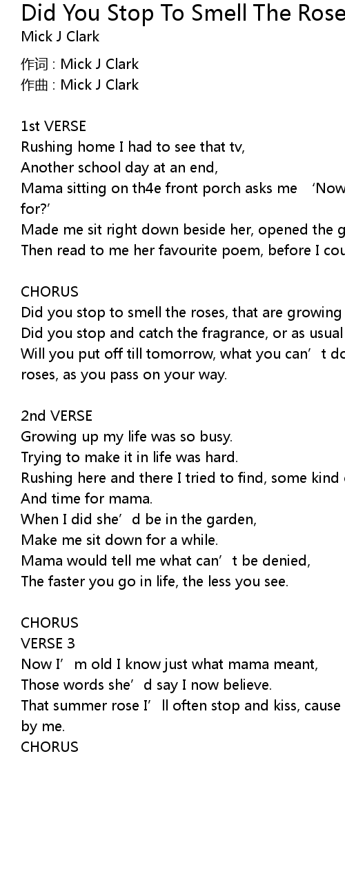 | Song | Did You Stop To Smell The Roses |