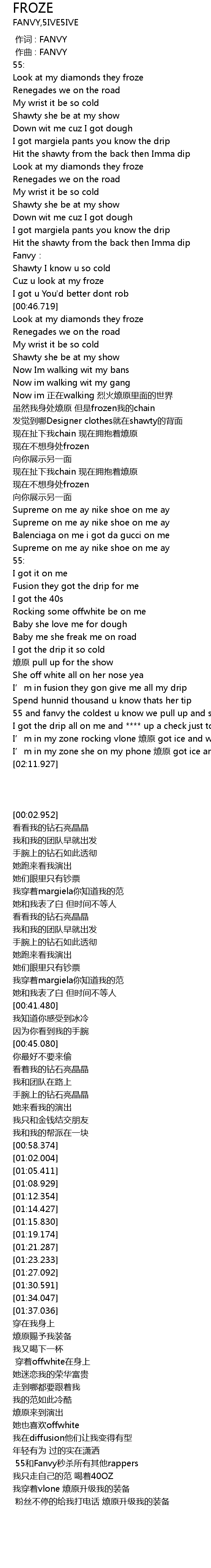 | [02:05.356] | I' m in my zone rocking vlone liao yuan got ice and we froze |