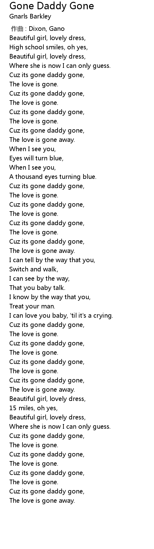| [01:33.45] | Cuz its gone daddy gone, |