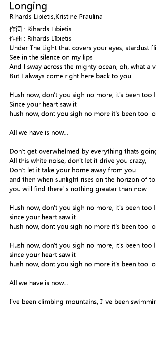 | hush now, dont you sigh no more it' s been too long | |