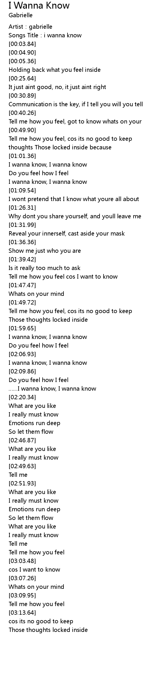 | [01:42.41] | Tell me how you feel cos I want to know |
