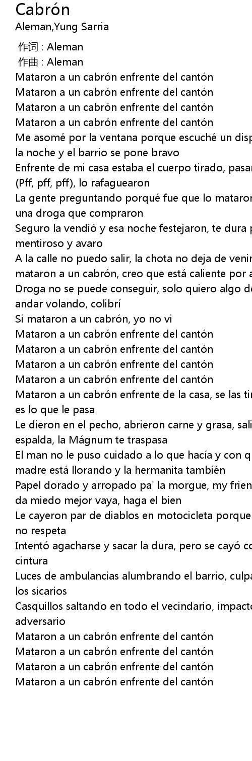 | [01:32.339] | Mataron a un cabró n enfrente del cantó n |