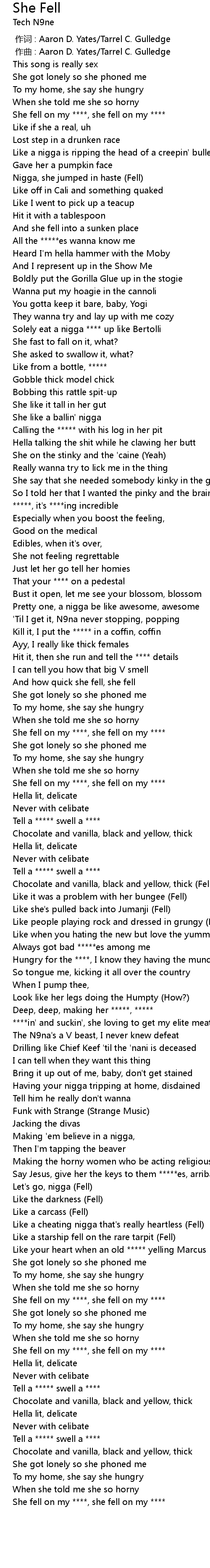 | [00:16.38] | She fell on my ****, she fell on my **** |