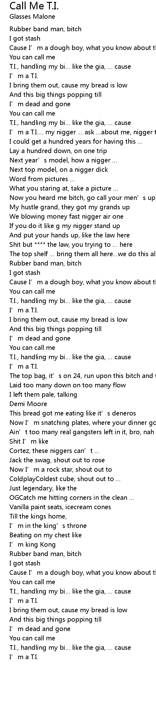 | I' m a T. I. my nigger ask about me, nigger that' s | |