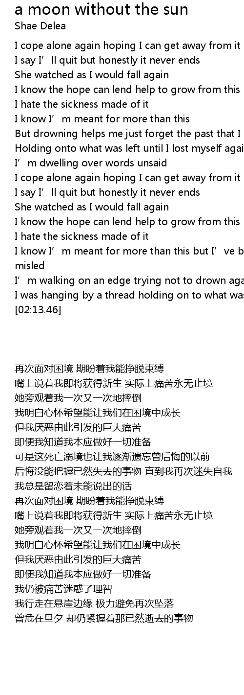 | [00:11.05] | I cope alone again hoping I can get away from it |