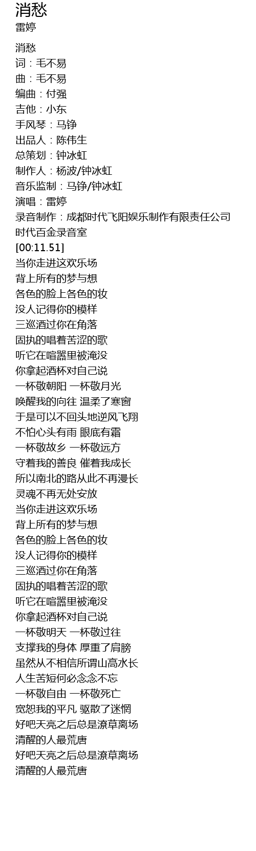 | [00:11.09] | 录音制作:成都时代飞阳娱乐制作有限责任公司 时代百金录音室 |