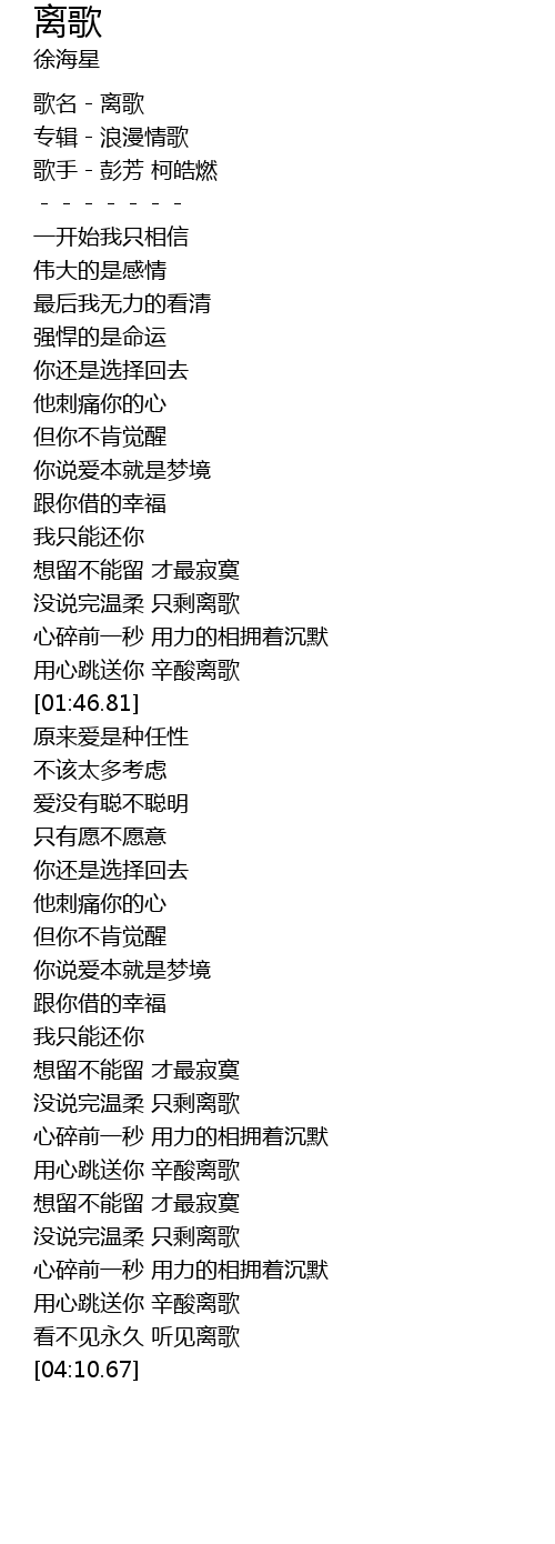 | [00:00.78] | 歌名-离歌 |