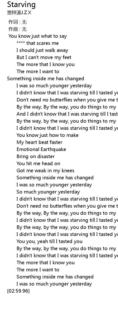 | [02:34.26] | I didn't know that I was starving till I tasted you |