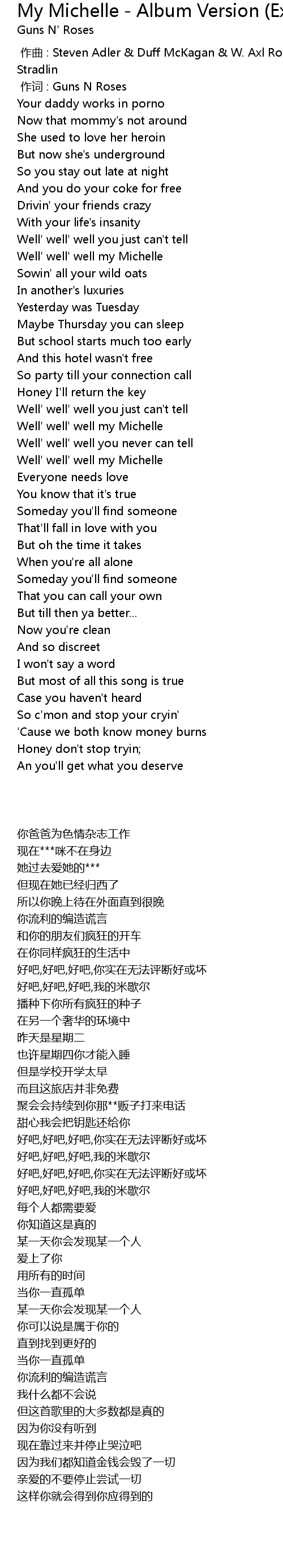 | [00:00.00] | zuo qu : Steven Adler Duff McKagan W. Axl Rose Slash Izzy Stradlin |