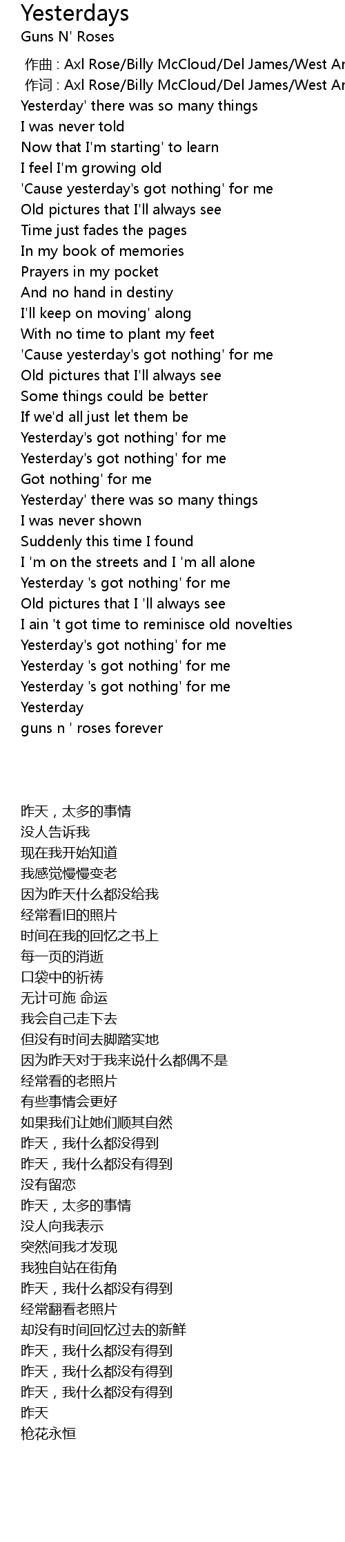 | [02:17.72] | Yesterday ' s got nothing' for me |