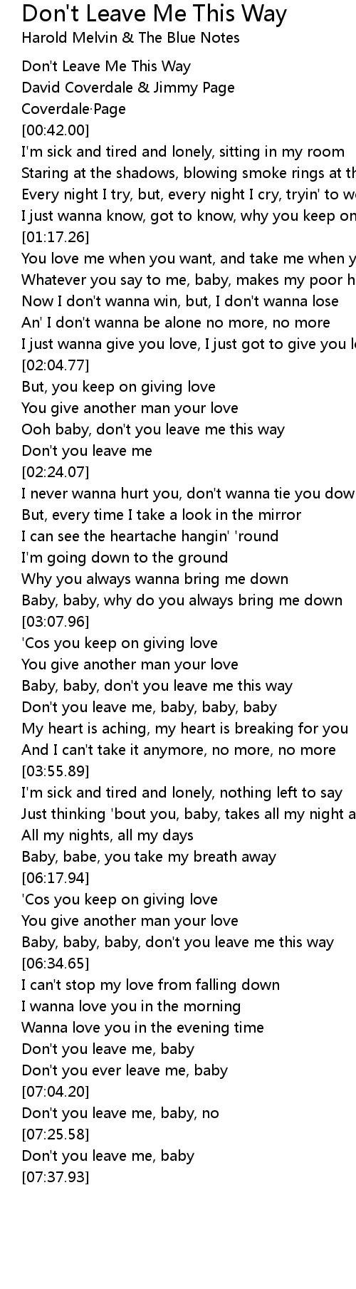 | [02:14.42] | Ooh baby, don' t you leave me this way |