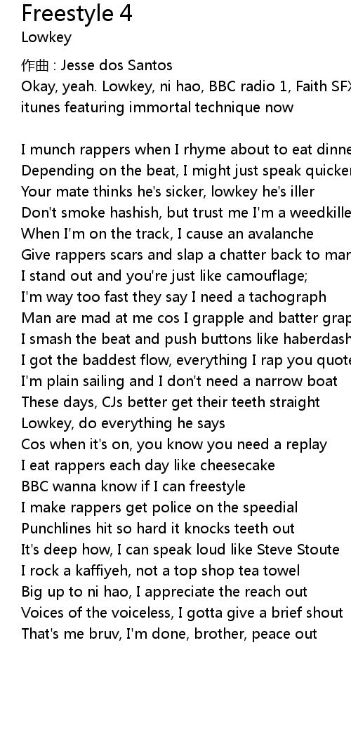 | Okay, yeah. Lowkey, ni hao, BBC radio 1, Faith SFX, Voices of the voiceless off itunes featuring immortal technique now | |