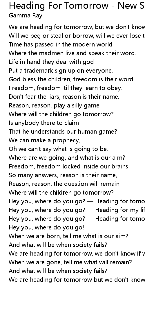 | Hey you, where do you go? Heading for tomorrow | |