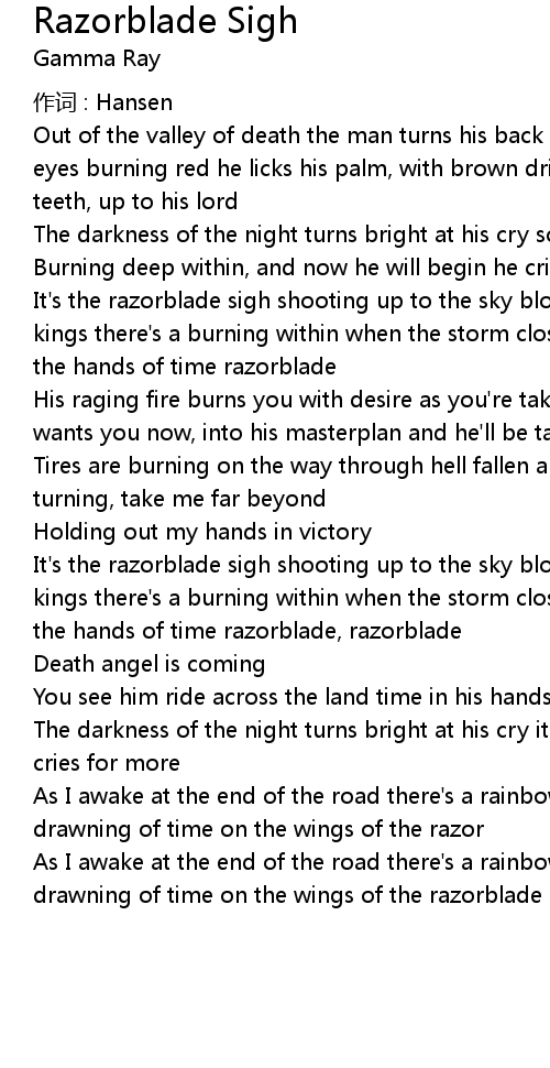 | It' s the razorblade sigh shooting up to the sky blood on the wings, one of the kings there' s a burning within when the storm closes in he is one of a kind, in the hands of time razorblade, razorblade | |