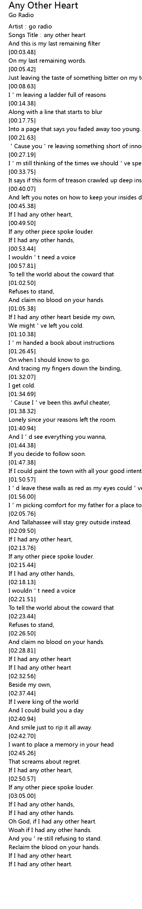 | [00:01.29] | Songs Title: any other heart |