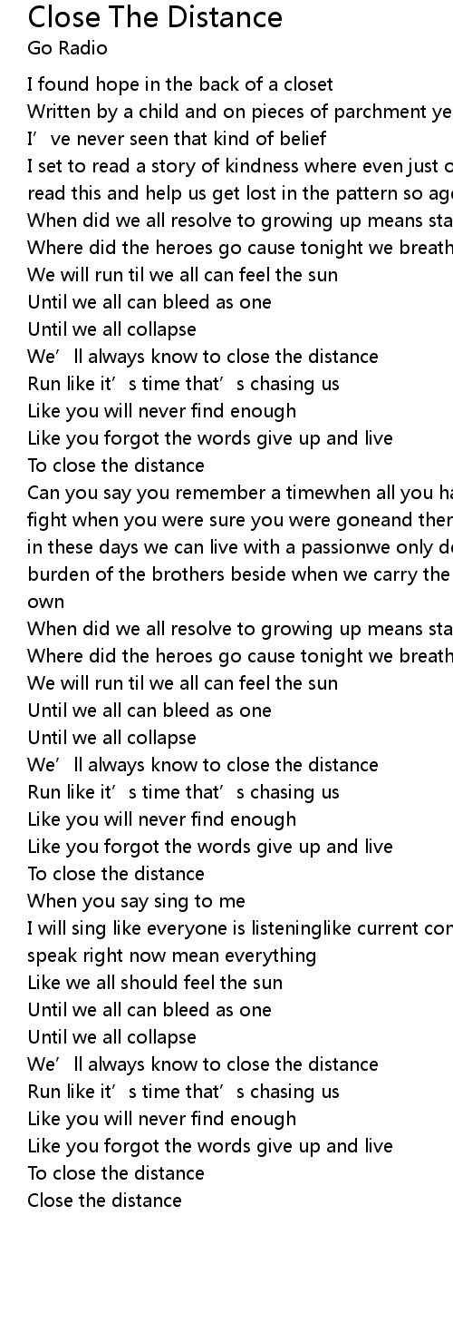 | Can you say you remember a timewhen all you had was a dream anda promise to fight when you were sure you were goneand there wasn’t a hope to carry onwell in these days we can live with a passionwe only deserve when we cherish the burden of the brothers beside when we carry the bones that cant walk on their own | |