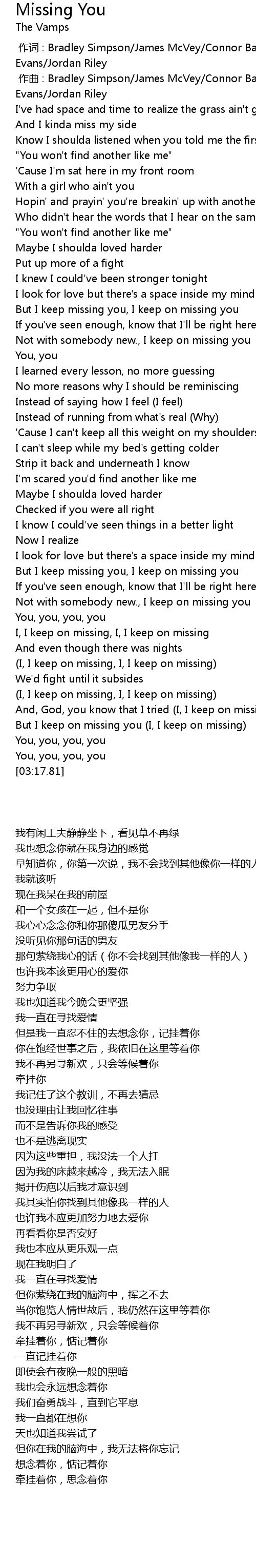 | [02:30.41] | I, I keep on missing, I, I keep on missing |