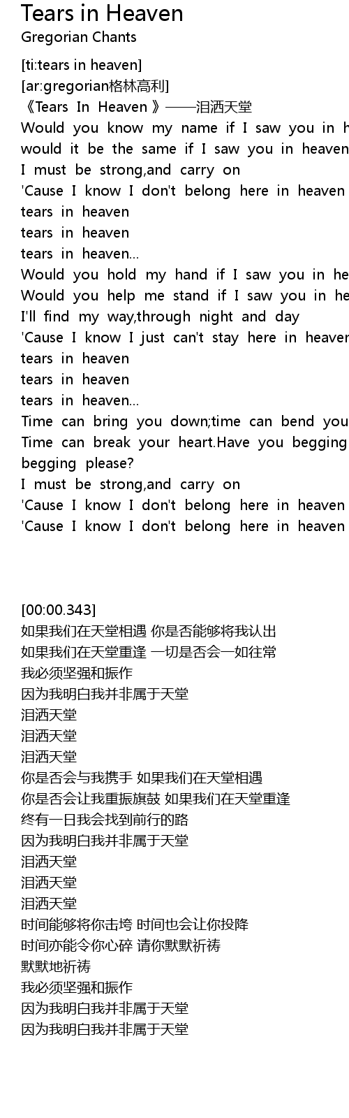 | [00:00.343] | Tears In Heaven lei sa tian tang |