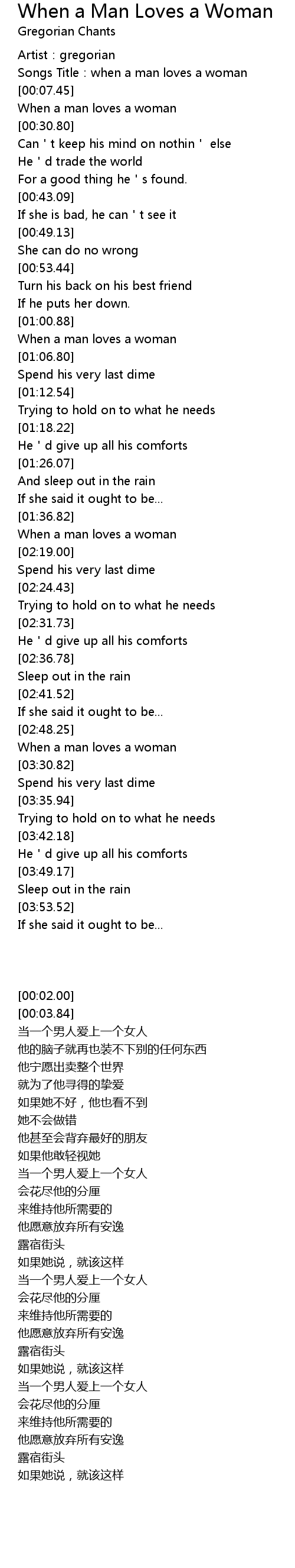 | [00:03.84] | Songs Title: when a man loves a woman |