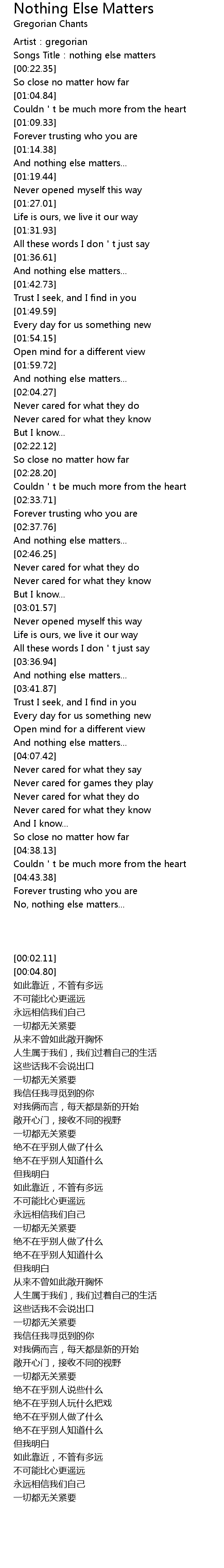 | [00:04.80] | Songs Title:nothing else matters |