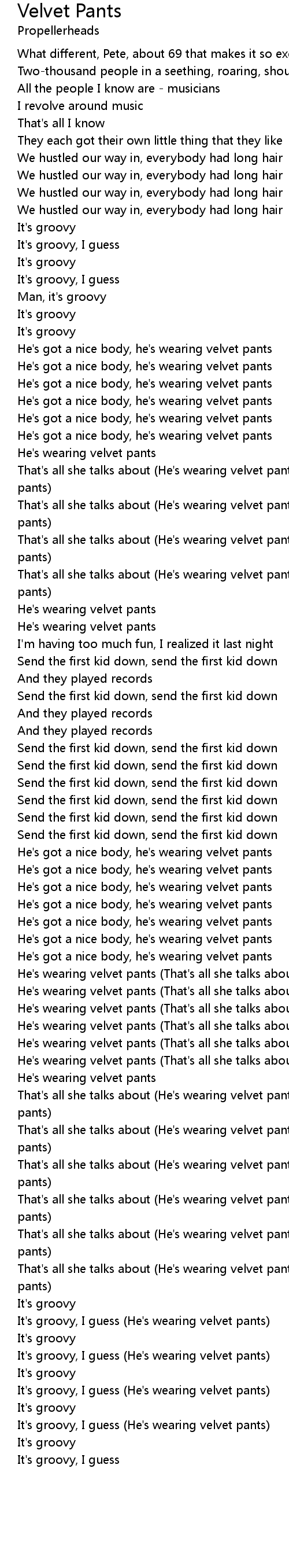 He's wearing velvet pants (That's all she talks about) |