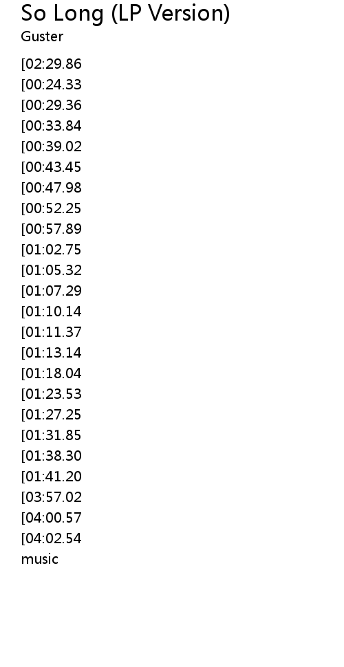 | [00:06.00][02:29.86][00:21.17] | SO LONG BEEN WAITING SO LONG |