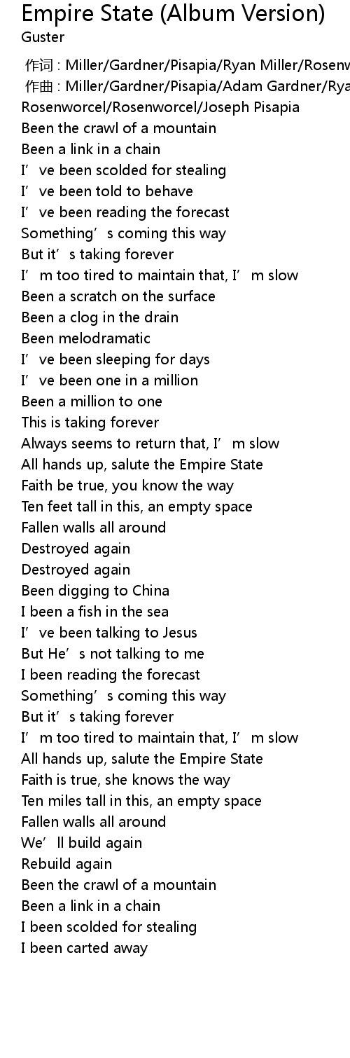 | [00:01.000] | zuo qu : Miller Gardner Pisapia Adam Gardner Ryan Miller Brian Rosenworcel Rosenworcel Joseph Pisapia |