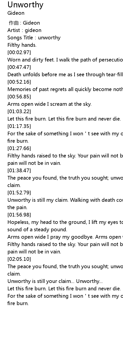 | [02:06.79] | Unworthy is still your claim... Unworthy... |