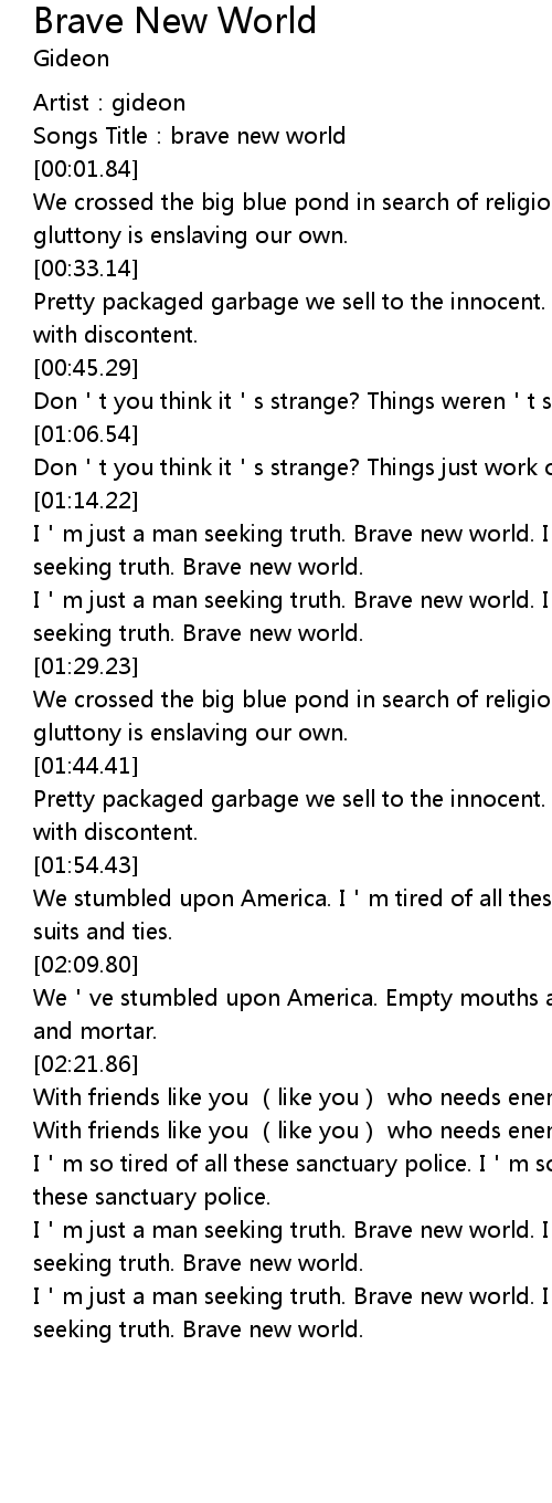 | [01:25.79] | I m just a man seeking truth. Brave new world. I m just a man seeking truth. Brave new world. |