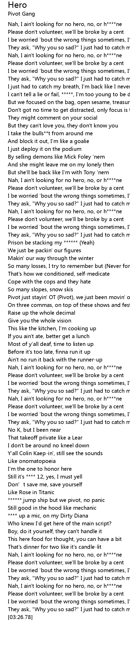 | [03:11.46] | Nah, I ain't looking for no hero, no, or h****ne |