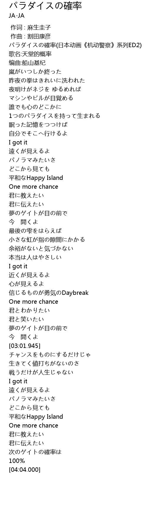 | [00:00.300] | パラダイスの確率(日本动画《机动警察》系列ED2) |