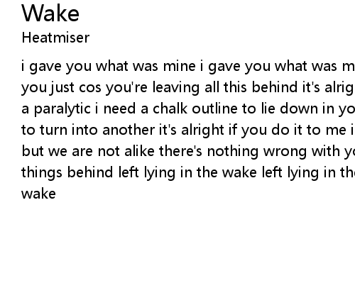 | i gave you what was mine i gave you what was mine but there's nothing wrong with you just cos you're leaving all this behind it's alright if you do it to me i'm a paralytic i need a chalk outline to lie down in you know one wound just wans to turn into another it's alright if you do it to me i gave you what was mine but we are not alike there's nothing wrong with you just cos you leave a few things behind left lying in the wake left lying in the wake left lying in the wake |