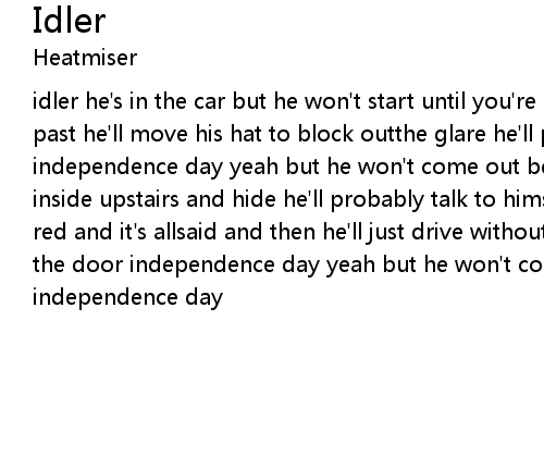 | idler he's in the car but he won't start until you're gone upstairs and driving past he'll move his hat to block outthe glare he'll pull up to open the door independence day yeah but he won't come out before indenpendence day so go back inside upstairs and hide he'll probably talk to himself about you til eyes are red and it's allsaid and then he'll just drive without you he'll pull up to open the door independence day yeah but he won't come out before independence day independence day |