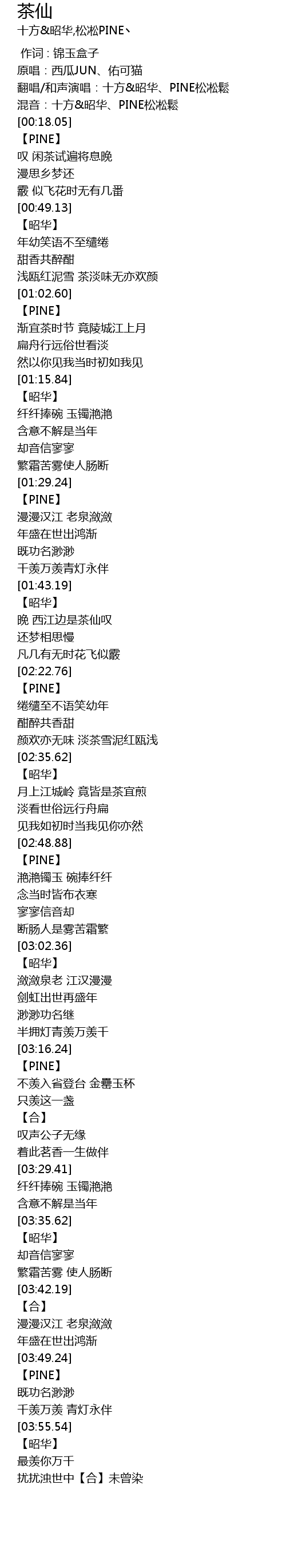 | [00:13.02] | 翻唱/和声演唱:十方&昭华、PINE松凇鬆 |