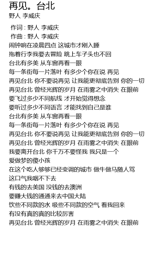 | [00:59.191] | 再见台北 你不要说再见 让我能更彻底告别 你的一切 |