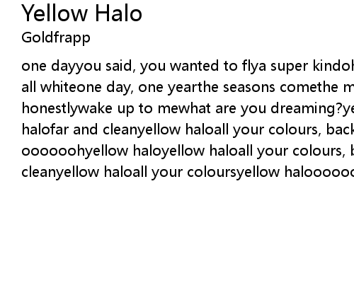 | one dayyou said, you wanted to flya super kindoh, and i roseto the moonwearing all whiteone day, one yearthe seasons comethe moon's still heredon't break honestlywake up to mewhat are you dreaming?yellow haloall your coloursyellow halofar and cleanyellow haloall your colours, back whenyellow halooooooh oooooohyellow haloyellow haloall your colours, back whenyellow halofar and cleanyellow haloall your coloursyellow halooooooh ooooooh |