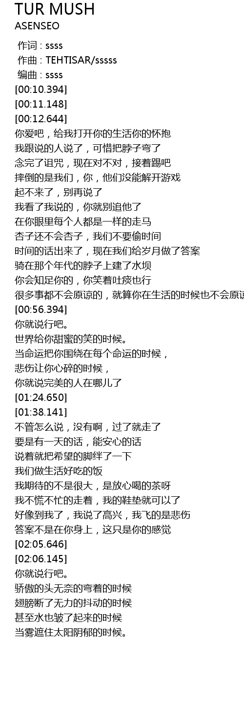 | [00:01.000] | zuo qu : TEHTISAR sssss |