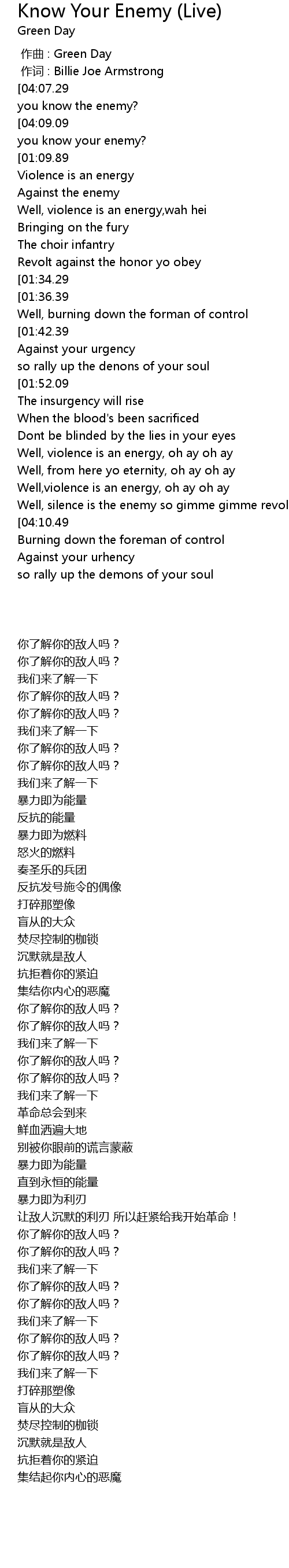 | [04:16.19][04:09.09][04:01.89][01:58.49][01:51.59][01:15.39][01:08.69][01:01.29] | Do you know your enemy? |
